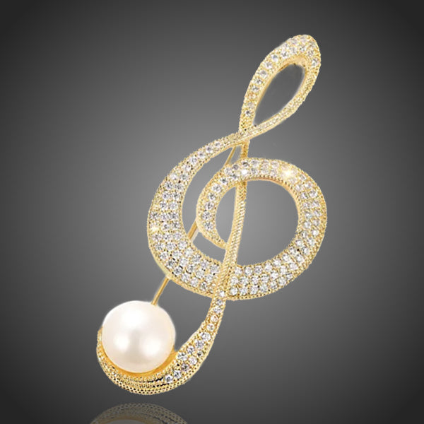 Nádherná brošňa s motívom huslového kľúča vykladaná žiarivými čírymi zirkónmi doplnená elegantnou bielou riečnou perlou. Zachováva si dlhotrvajúci lesk a jas. Antialergické.