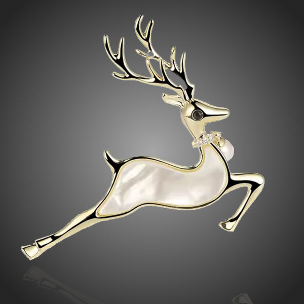 Krásna elegantná dámska brošňa s motívom jeleňa s perleťou doplnená drobnými čírymi zirkónmi a visicou shell perlou na jeho krku. Zachováva si dlhotrvajúci lesk a jas. Antialergické.