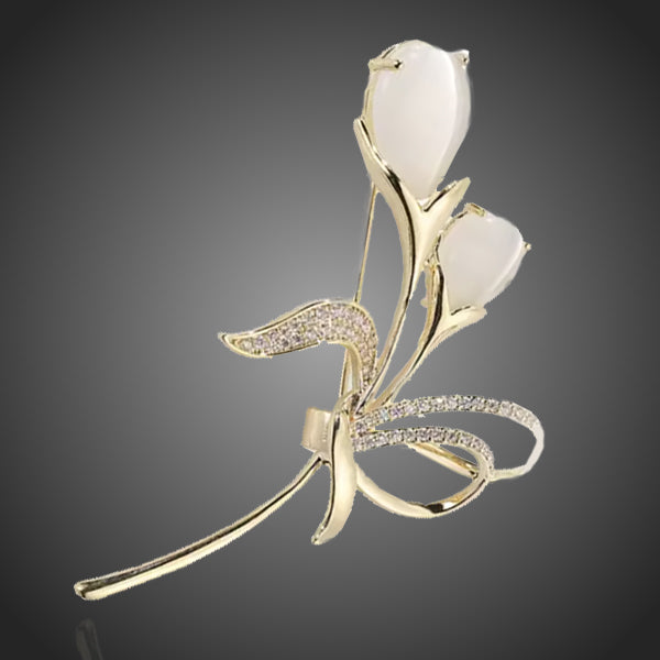 Jemná dámska brošňa s motívom tulipánov s mačacím okom doplnená zirkónmi. Zachováva si dlhotrvajúci lesk a jas. Antialergické.