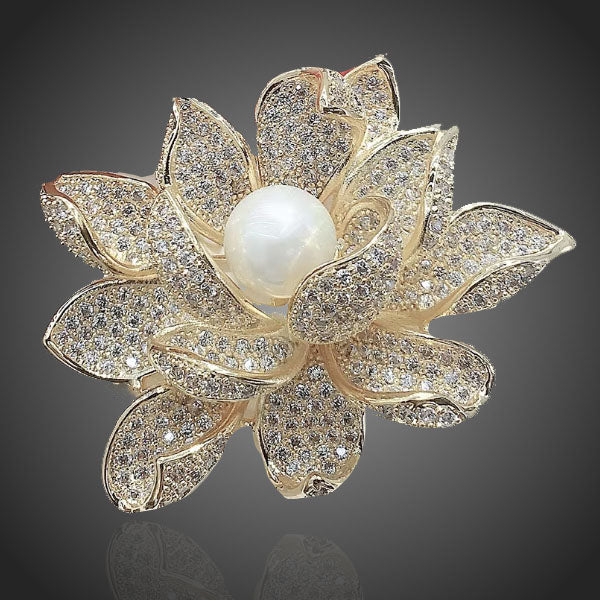 Krásna kvetinová brošňa v strede vyzdvihnutá shell perlou lemovaná stovkami čírych žiariacich zirkónov. Zachováva si dlhotrvajúci lesk a jas. Antialergické.