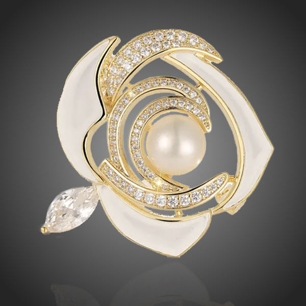 Nádherná dámska elegantná brošňa s bielou riečnou perlou, bielym smaltom doplnená žiarivými čírymi zirkónmi. Zachováva si dlhotrvajúci lesk a jas. Antialergické.