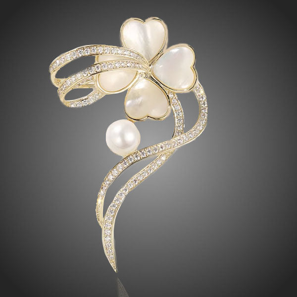 Krásna elegantná dámska brošňa so štvorlístkom s perleťou doplnená mnohými čírymi zirkónmi a shell perlou. Zachováva si dlhotrvajúci lesk a jas. Antialergické.