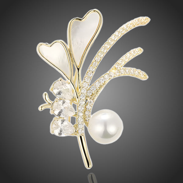 Nádherná elegantná dámska brošňa so zaujímavým dizajnom s lastúrou, čírymi zirkónmi a vyzdvihnutá bielou shell perlou. Zachováva si dlhotrvajúci lesk a jas. Antialergické.