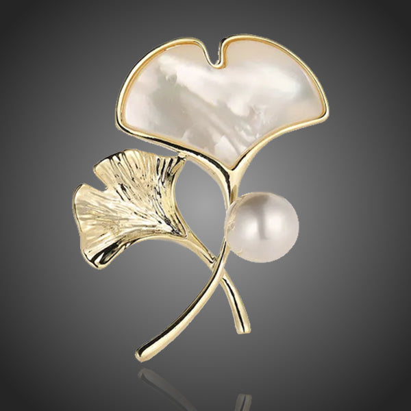 Krásna elegantná dámska brošňa s dvoma lístkami s perleťou doplnená bielou riečnou perlou. Zachováva si dlhotrvajúci lesk a jas. Antialergické.