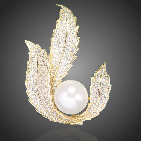 Nádherná lístková brošňa v zlatom šate so stovkami žiariacich drobných zirkónov doplnená bielou krištáľovou perlou. Zachováva si dlhotrvajúci lesk a jas. Antialergické.