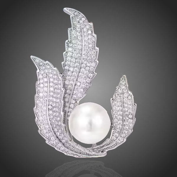 Nádherná lístková brošňa v stiebornom šate so stovkami žiariacich drobných zirkónov doplnená bielou krištáľovou perlou. Zachováva si dlhotrvajúci lesk a jas. Antialergické.