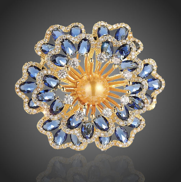 Luxusná nádherná brošňa v ladnom tvare kvetu vykladaná žiarivými modrými a čírymi zikrónmi. V strede je krásna perla s nádychom zlata. Zachováva si dlhotrvajúci lesk a jas. Antialergické.