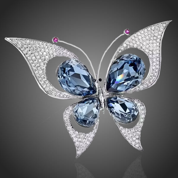 Krásna luxusná dámska motýlia brošňa vykladaná mnohými drobnými čírymi krištáľmi. Telo motýla tvoria modré kvalitné žiariace krištále s detailom ružových krištálikov na tykadielkach. Zachováva si dlhotrvajúci lesk a jas. Antialergické.