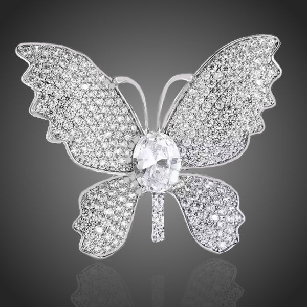Krásna luxusná dámska motýlia brošňa vykladaná mnohými drobnými čírymi zirkónmi s hlavným čírym zirkónom v strede motýla. Zachováva si dlhotrvajúci lesk a jas. Antialergické.