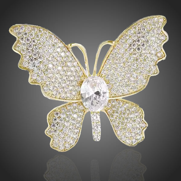 Krásna luxusná dámska motýlia brošňa vykladaná mnohými drobnými čírymi zirkónmi s hlavným čírym zirkónom v strede motýla. Zachováva si dlhotrvajúci lesk a jas. Antialergické.