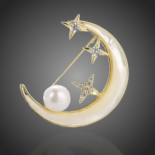 Nádherná éterická dámska brošňa s motívom polmieca s bielou riečnou perlou a hviezdičkami so žiarivými zirkónmi. Zachováva si dlhotrvajúci lesk a jas. Antialergické.