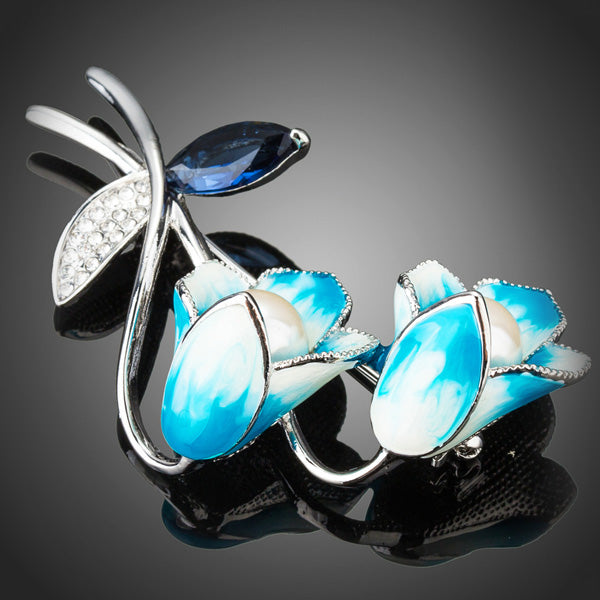 Nádherná brošňa s modrými tulipánmi vykladaná krištáľmi ukrývajúca Swarovski perličky v modrastej olejomaľbe. Zachováva si dlhotrvajúci lesk a jas. Antialergické.