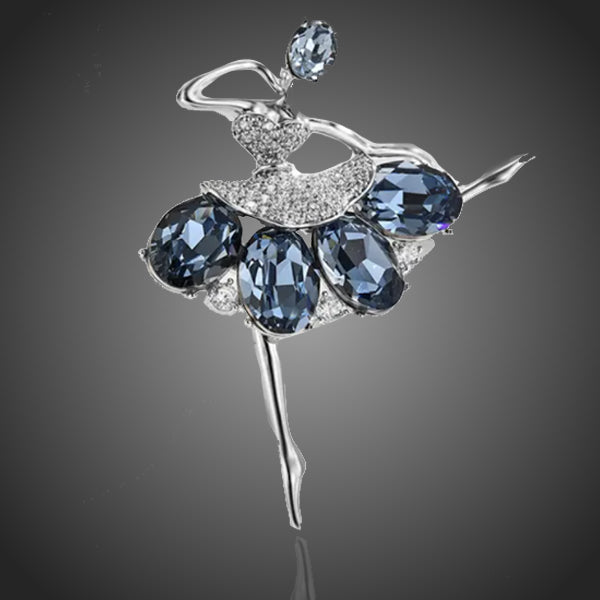 Krásna éterická dámska brošňa - žena v tanci vykladaná modrými a čírymi krištáľmi sa stane elegantným doplnkom. Zachováva si dlhotrvajúci lesk a jas. Antialergické.