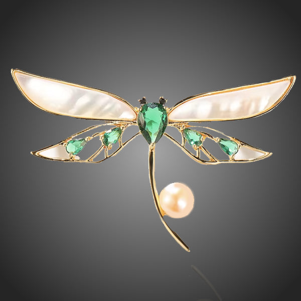 Nádherná dámska elegantná brošňa v tvare vážky s bielou riečnou perlou vykladaná žiarivými zelenými zirkónmi doplnená bielou lastútou. Zachováva si dlhotrvajúci lesk a jas. Antialergické.