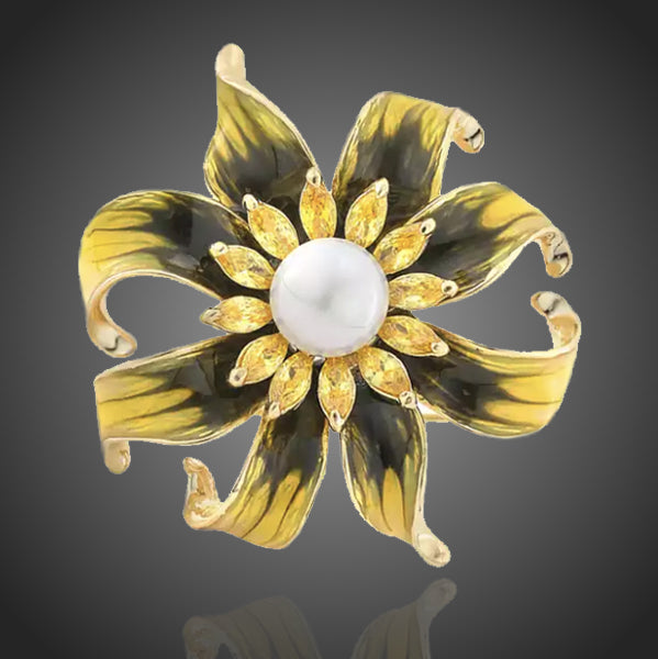 Krásna kvetinová brošňa v žltočiernej olejomaľbe vyzdvihnutá shell perlou a žltými zirkónmi. Zachováva si dlhotrvajúci lesk a jas. Antialergické. Zachováva si dlhotrvajúci lesk a jas. Antialergické.