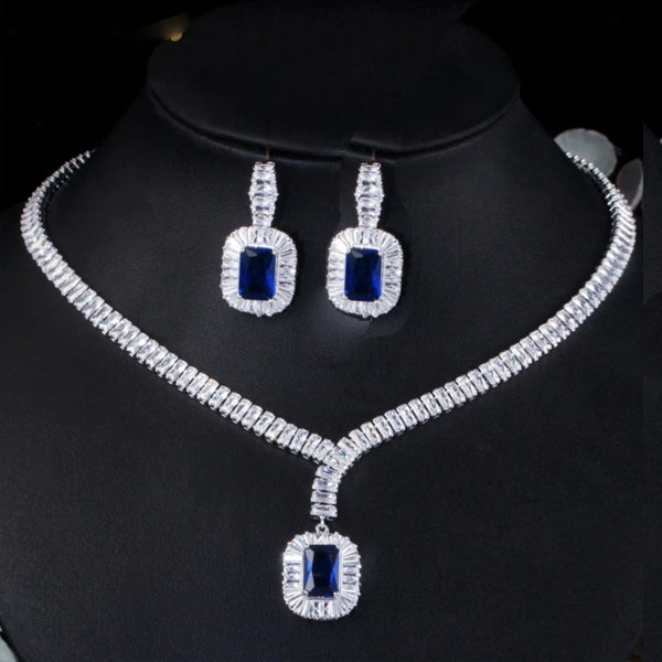 Elegantný žiarivý set s mnohými čírymi zirkónmi s diamantovým odleskom. Set je zvýrazený hlavnými obdlžnikovými modrými zirkónmi, ktoré dotvárajú celkový efekt tohto krásneho šperku. Vďaka kvalitnej galvanizácii 3 vrstvou bieleho zlata si zachováva dlhotrvajúci lesk a jas. Bez obsahu niklu, olova, kadmia. Antialergické.