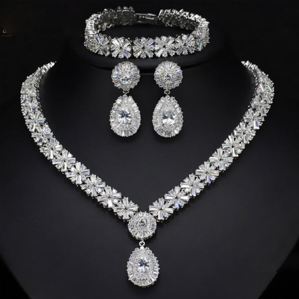 Luxusný bohato zdobený set so stovkami čírych žiarivých zirkónov s diamantovým odleskom v ladných kvapkách v spoločnosti uchváti. Krásny spoločenský alebo svadobný set. Jeho detaily Vás v skutočnosti nadchnú. Súčasťou setu je náhrdelník, náušnice, náramok. Vďaka kvalitnej galvanizácii 3 vrstvou bieleho zlata si zachováva dlhotrvajúci lesk a jas. Bez obsahu niklu, olova, kadmia. Antialergické.