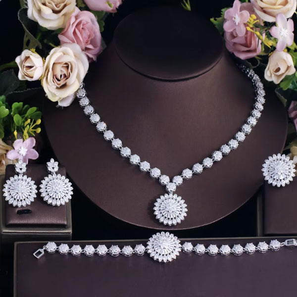 Ladný set s motívom kvetov vykladaný stovkami čírych zirkónov na dáme zažiari. Krásny spoločenský alebo svadobný set. Set obsahuje náhrdelník, náušnice, náramok a nadstaviteľný prsteň. Vďaka kvalitnej galvanizácii 3 vrstvou bieleho zlata si zachováva dlhotrvajúci lesk a jas. Bez obsahu niklu, olova, kadmia. Antialergické.