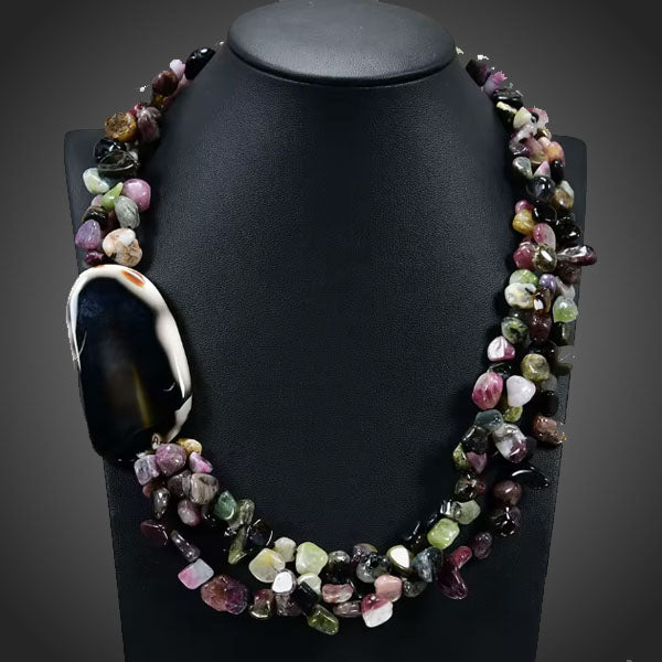 Exkluzívny trojradový náhrdelník s prírodným farebným turmalínom a achátom v dekolte vynikne. Kvalita kameňov sa určuje sfarbením a tvarom. Každý kus je ručne vyrobený originál. Pre jedinečnú dámu.