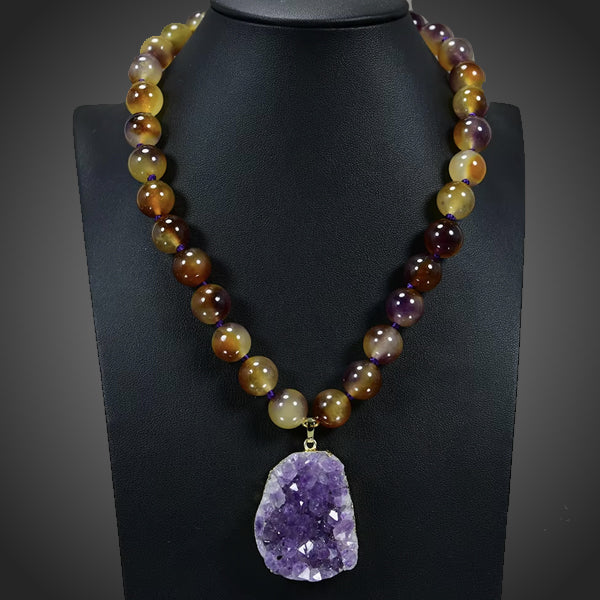 Exkluzívny náhrdelník s krásnym prírodným jadeitom v odtieňoch hnedej doplnený čarokrásnym fialovým ametystom v dekolte vynikne. Kvalita kameňov sa určuje sfarbením a tvarom. Každý kus je ručne vyrobený originál. Pre jedinečnú dámu.