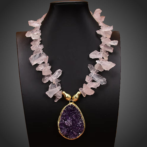 Exkluzívny náhrdelník s prírodným fialovým ametystom doplnený ruženinom v dekolte vynikne. Kvalita kameňov sa určuje sfarbením a tvarom. Každý kus je ručne vyrobený originál. Pre jedinečnú dámu.
