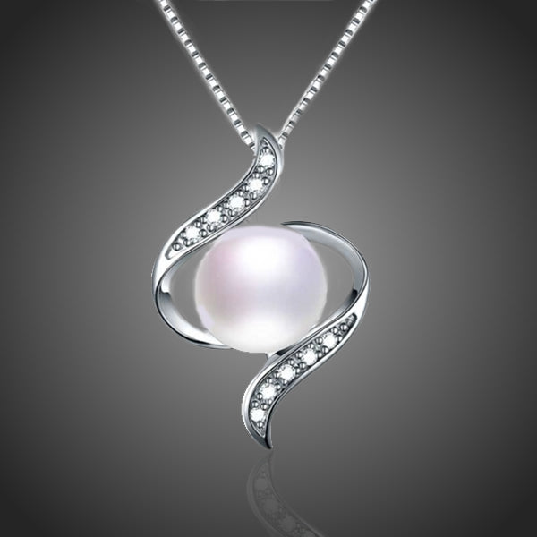 Krásny ladný náhrdelník so zaujímavým príveskom, do ktorého je osadená biela riečna perla. Prívesok je zdobený drobnými zirkónmi s použitím špeciálnej techniky micropave. Vďaka galvanizácii platinou si zachováva dlhotrvajúci lesk a jas. Bez obsahu niklu, olova, kadmia. Antialergické.