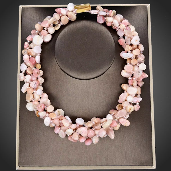 Exkluzívny viacradový náhrdelník s prírodným ružovým opalom doplnený kryštálmi v dekolte vynikne. Kvalita kameňov sa určuje sfarbením a tvarom. Každý kus je originál. Pre jedinečnú dámu.