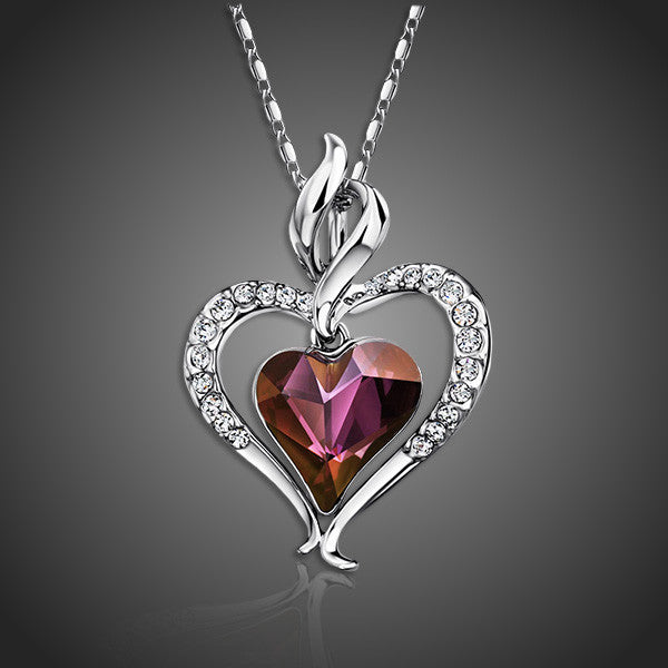 Náhrdelník s príveskom srdca s krásnym žiarivým magenta krištáľom, obkolosený čírymi krištáľmi s dvoma polkami spájajúceho sa srdca. Srdiečko v strede je pohyblivé, čo vytvára krásny efekt. Srdce je symbol lásky, priateľstva a puta. Zachováva si dlhotrvajúci lesk a jas. Bez obsahu niklu, olova, kadmia. Antialergické.