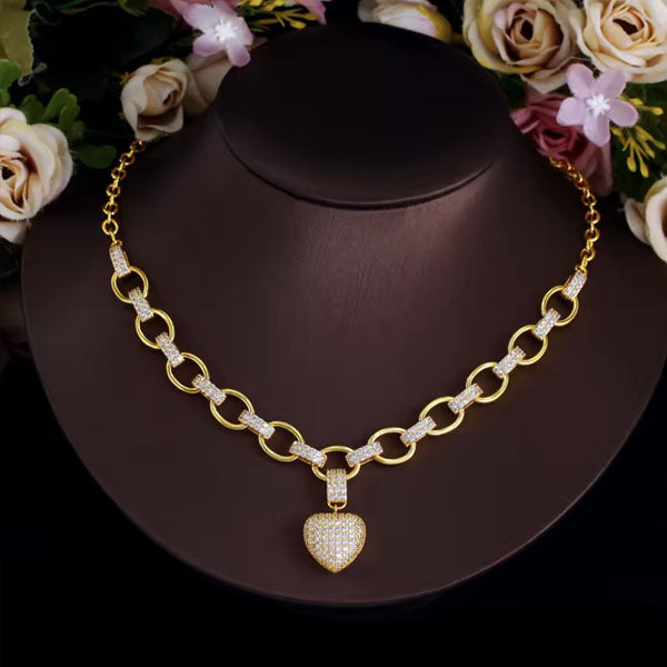 Tento výrazný náhrdelník je dokonalým spojením elegancie a modernej romantiky. Pozlátená retiazka z väčších očiek pôsobí luxusne a sebavedomo, zatiaľ čo trblietavé detaily dodávajú šperku jemnosť a ženský pôvab. Dominantou je prívesok v tvare srdca bohato osadený drobnými kamienkami, ktorý pri každom pohybe nádherne zachytáva svetlo. Vďaka kvalitnej galvanizácii si zachováva dlhotrvajúci lesk a jas. Bez obsahu niklu, olova, kadmia. Antialergické.