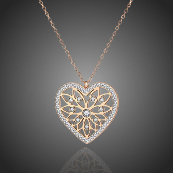 Krásny náhrdelník so srdcom s jemným dizajnom kvetu v srdci s čírymi krištáľmi v dekolte zažiari. Zachováva si dlhotrvajúci lesk a jas. Antialergické.