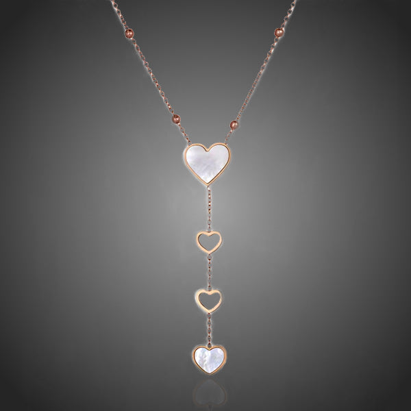 Jemný náhrdelník so štvoricou srdiečok obohatený bielou lastúrou. Zachováva si dlhotrvajúci lesk a jas. Antialergické.