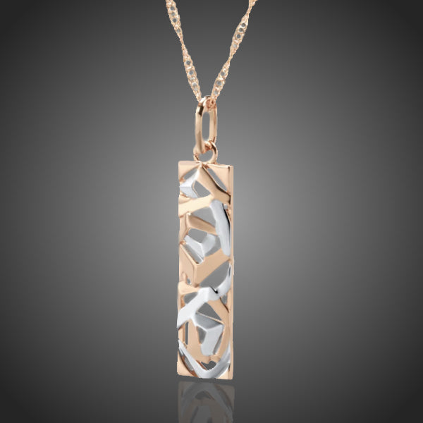 Krásny dámsky náhrdelník s s paličkou v kombinácii farieb bieleho a ružoveho zlata s vyrezavanými prvkami vynikne v ženskom dekolte. Zachováva si dlhotrvajúci lesk a jas. Bez obsahu niklu, olova, kadmia. Antialergické.