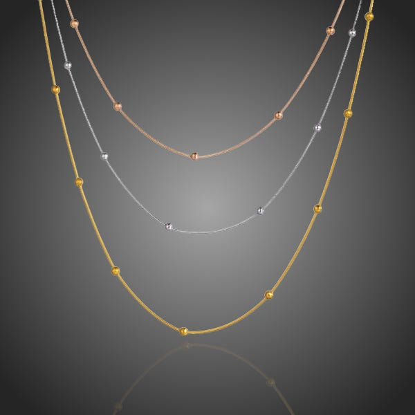 Krásny jemný náhrdelník tvorený z troch jemných retiazok v bielom, ružovom a žltom zlate doplnený dorbnými guličkami sa stane Vašim milým doplnkom. Zachováva si dlhotrvajúci lesk a jas. Antialergické.