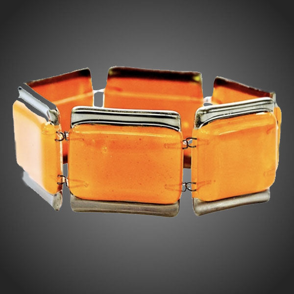 Nádherný originálny náramok v prevedení ručne malovaného oranžového odolného skla zdobeného pravou platinou. Všetky kovové komponenty v šperku sú z leštenej chirurgickej ocele 316L, antialergické.