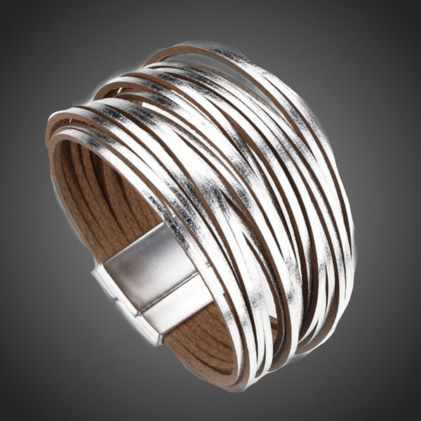 Krásny kožený viacvrstvový náramok v odtieňoch striebornej sa stane Vašim milým doplnkom. Uzatváranie na magnet. Antialergické.