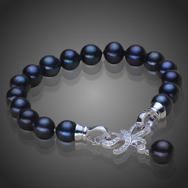 Náramok s čiernymi riečnymi perlami s perlovým odnímateľným príveskom. Prívesok môžete použiť na retiazku alebo nosiť ako celok. Zapínanie si vďaka galvanizácii platinou zachováva dlhotrvajúci lesk a jas. Antialergické.