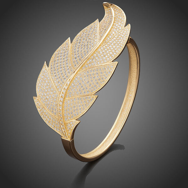 Nádherný luxusný dámsky náramok v tvare elegantného listu vykladaný stovkami čírych zirkónov vsadených špeciálnou technikou micro-pave na ruke zažiari. Vďaka galvanizácii 3 žltého vrstvou zlata si zachováva dlhotrvajúci lesk a jas Bez obsahu niklu,olova, kadmia. Antialergické.