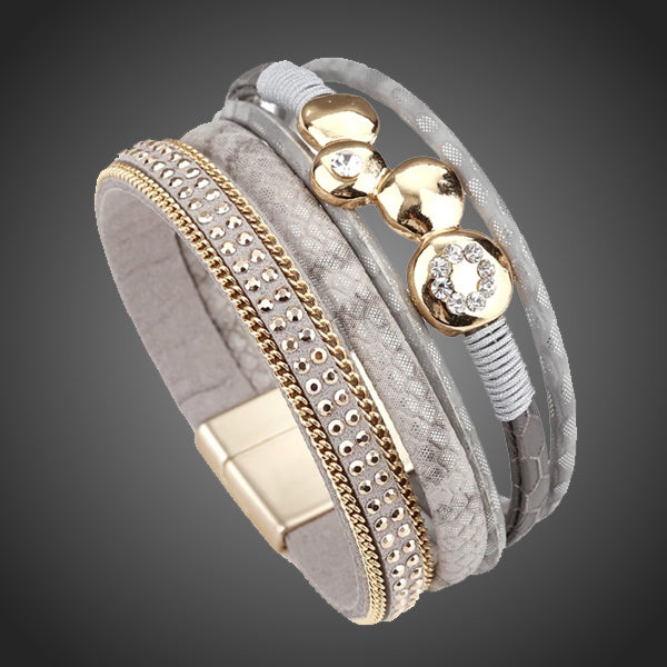 Trendy kožený šedozlatý náramok so zlatými aplikáciami a krištáľmi. Uzatváranie na magnet. Antialergické.