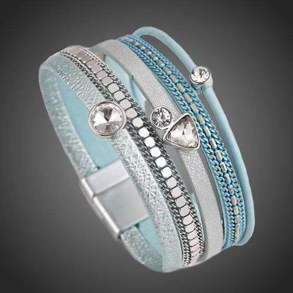 Trendy kožený modrý náramok s rôznymi aplikáciami s krištáľmi. Uzatváranie na magnet. Antialergické.