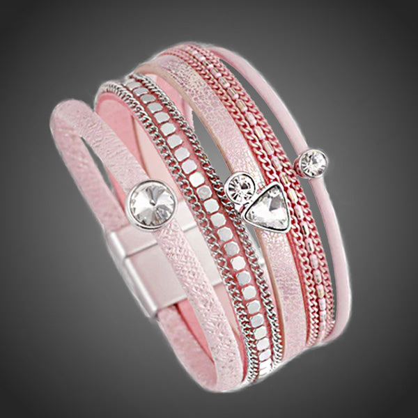 Trendy kožený ružový náramok s rôznymi aplikáciami s krištáľmi. Uzatváranie na magnet. Antialergické.
