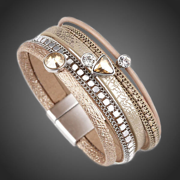 Trendy kožený zlatý náramok s rôznymi aplikáciami s krištáľmi. Uzatváranie na magnet. Antialergické.