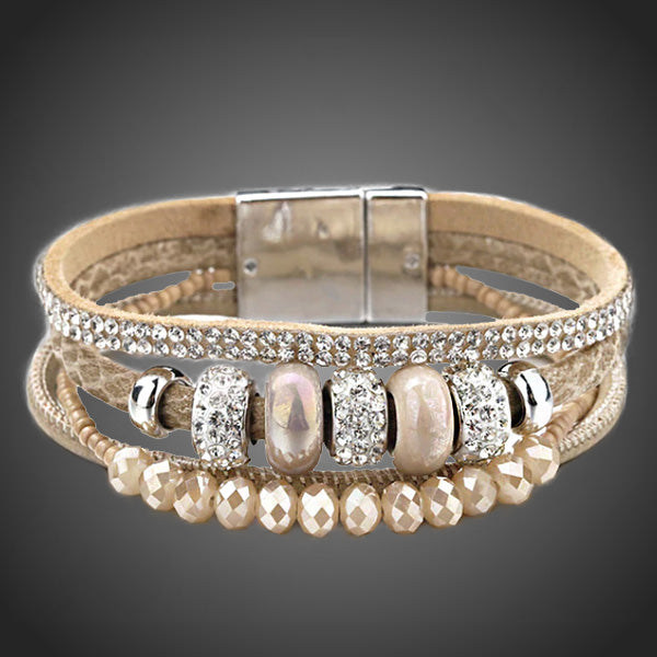 Trendy kožený do zlatista ladený náramok s rôznymi aplikáciami a krištáľmi. Uzatváranie na magnet. Antialergické.