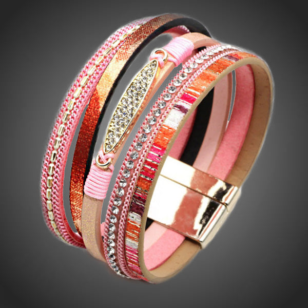 Trendy kožený farebný náramok v odtieňoch ružovej so zaujímavými aplikáciami a krištáľmi. Uzatváranie na magnet. Antialergické.