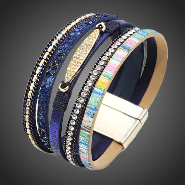Trendy kožený farebný náramok v odtieňoch modrej so zaujímavými aplikáciami a krištáľmi. Uzatváranie na magnet. Antialergické.