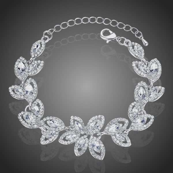 Nádherný lístkový náramok s mnohými čírymi krištáľmi. Vhodný aj ako svadobný, či spoločenský šperk. Zachováva si dlhotrvajúci lesk a jas.