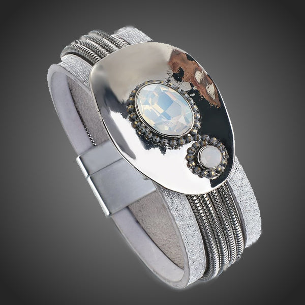 Zaujímavý kožený náramok s so striebornom aplikáciou s mliečnomodrým krištáľom na ruke zažiari. Uzatváranie na magnet. Antialergické.