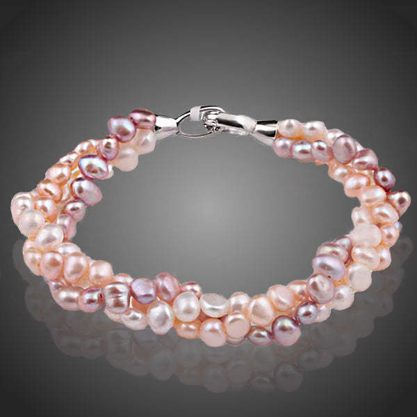 Krásny náramok s prepletanými bielymi, ružovými a tmavoružovými nerovnomernými perlami skrášli Vašu rúčku. Zapínanie si vďaka galvanizácii platinou zachováva si dlhotrvajúci lesk a jas. Antialergické.