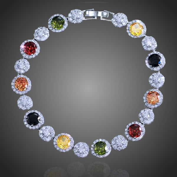 Žiarivý dámsky farebný náramok vykladaný čírymi, oranžovými, zelenými, červenými a čiernymi zirkónmi osvieži nejeden outfit. Súčasťou je aj 3 cm predĺženie na treťom obrázku, ktoré môžete použiť. Vďaka kvalitnej galavnizácii 3 vrstvou bieleho zlata si zachováva si dlhotrvajúci lesk a jas. Bez obsahu niklu, olova, kadmia. Antialergické.