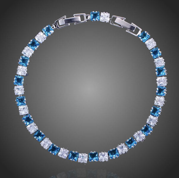 Jemný elegantný náramok s modrými a čírymi zirkónmi rozjasní Vašu rúčku. Precízne vsadené zirkóny očaria svojím žiarivým lieskom. Vďaka kvalitnej galavnizácii 3 bieleho bieleho zlata si zachováva si dlhotrvajúci lesk a jas. Bez obsahu niklu, olova, kadmia. Antialergické.