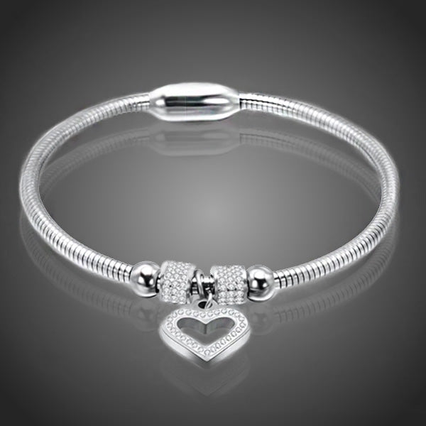 Milý dámsky náramok z chirurgickej ocele vo farbe bieleho zlata s padavým srdiečkom doplnený čírymi krištáľmi . Uzatváranie na magnet. Zachováva si dlhotrvajúci lesk a jas. Antialergické.